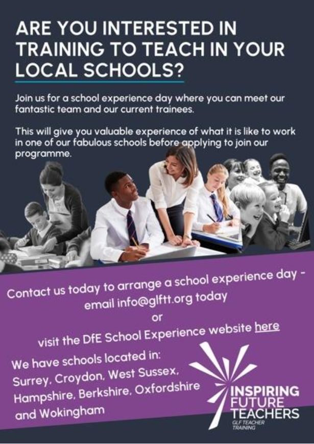To organise a school experience day here at our school, or one of our partner schools, please visit the Department for Education’s School Experience site HERE, fill in the contact form below or contact us at info@glftt.org